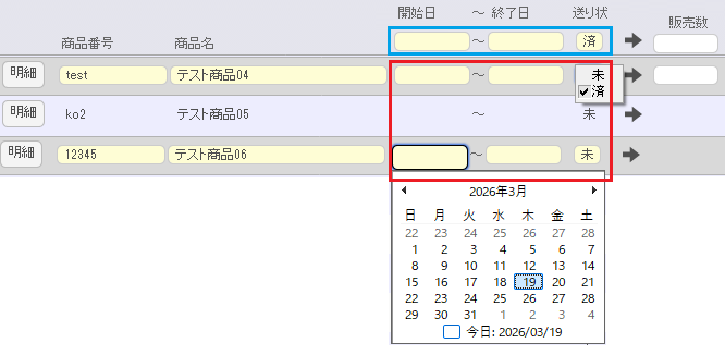 商品マスタに「開始日」「終了日」「送り状ステータス」を配置します